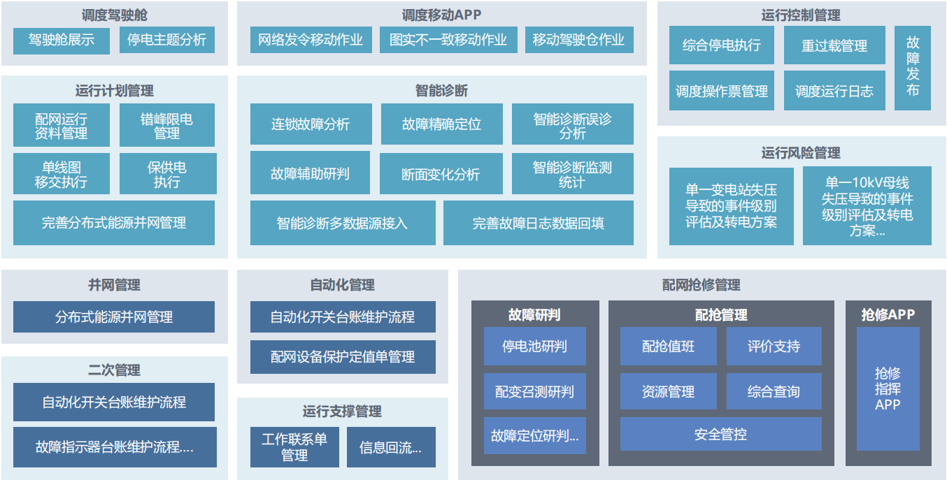 数字配电网管理解决方案, 是集调度生产 、专业管理和调度业务处理为一体化的调度运行管理支撑平台 , 实现配网调度业务全范围 、全过程 、智能化管理 , 业务功能上覆盖运行计划管理 、运行控制管理 、故障智能诊断、运行风险管理、并网管理、二次管理、自动化管理、 运行支持管理、调度移动APP 、配网抢修管理、调度驾驶舱等11项功能大类。 平台以信息化建设为支撑 , 促进各专业的管理标准化、 操作规范化 、流程一体化建设 , 实现了三个职能 (配网  调度、系统分析 、快速复电故障指挥) 、两个服务 (为客户服务、为县,/区局和供电所服务) 的工作目标。