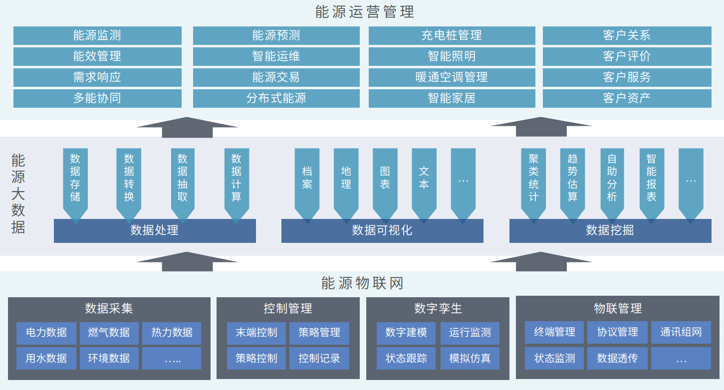 综合能源运营管理平台依托物联网、大数据、云计算、移动互联网等先进技术,汇集各类能源数据,集能源监测 、能源智 控 、能源运维 、能源销售、能源服务、能源大数据分析于一体,实现多能源系统之间的协调优化运行,为综合能源管理提供高效可靠的管理手段和行之有效的决策依据,帮助能源服务商提高能源利用效率,提升客户服务水平。